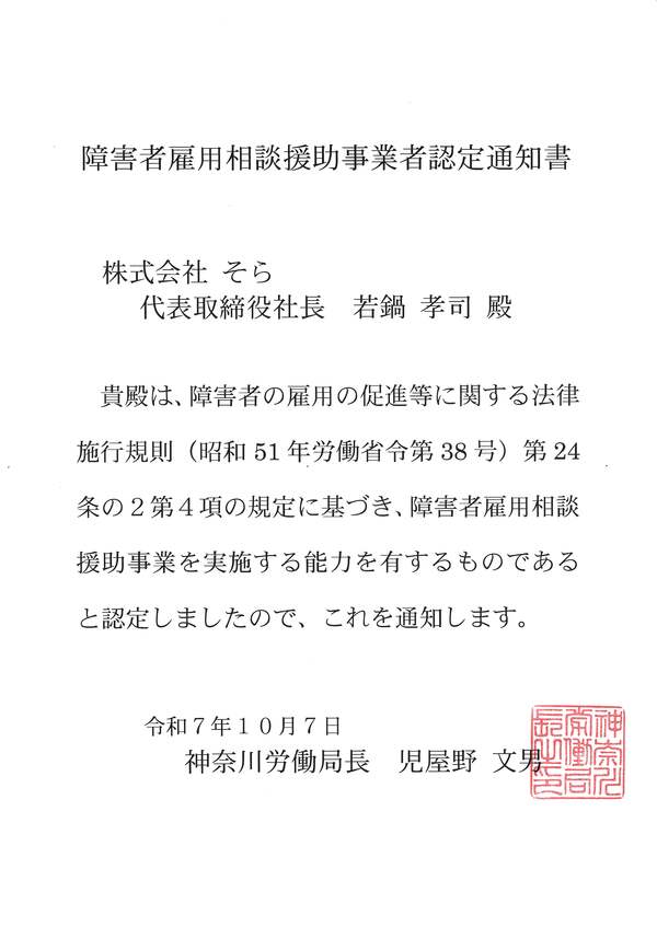 このたび、株式会社そらは2025年10月7日付で厚生労働省より「障害者雇用相談援助事業者」に認定されまし...